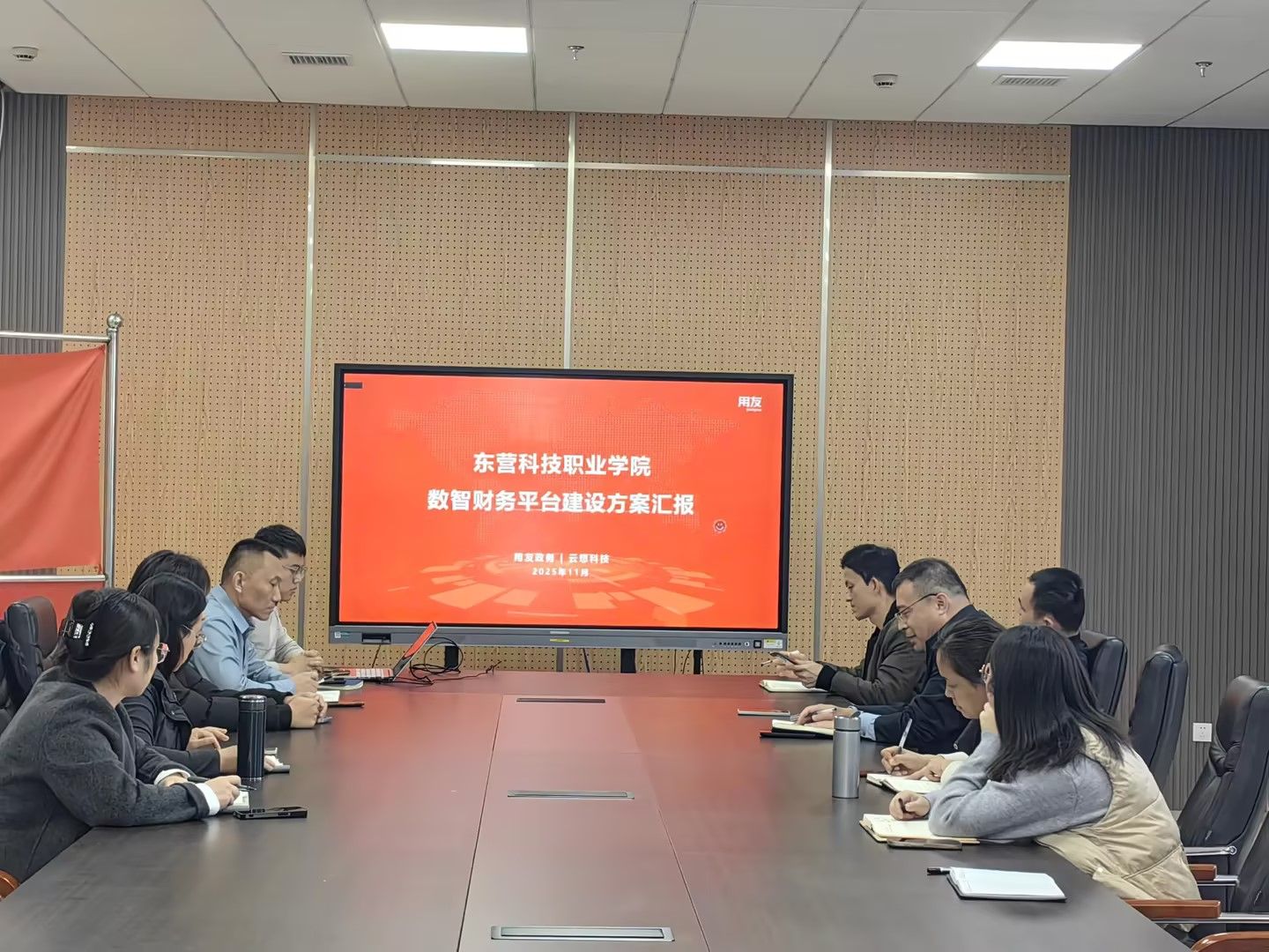 11月11日下午,用友政务张克瑞经理等三人到访东营科技职业学院,在图书楼812会议室进行数智财务平台建设方案汇报,学校党委委员、纪委书记、工会主席毛晓明出席会议,会议由财务处处长杨俊杰主持,教育技术与网络信息中心主任许学江及财务处全体成员参加会议。
