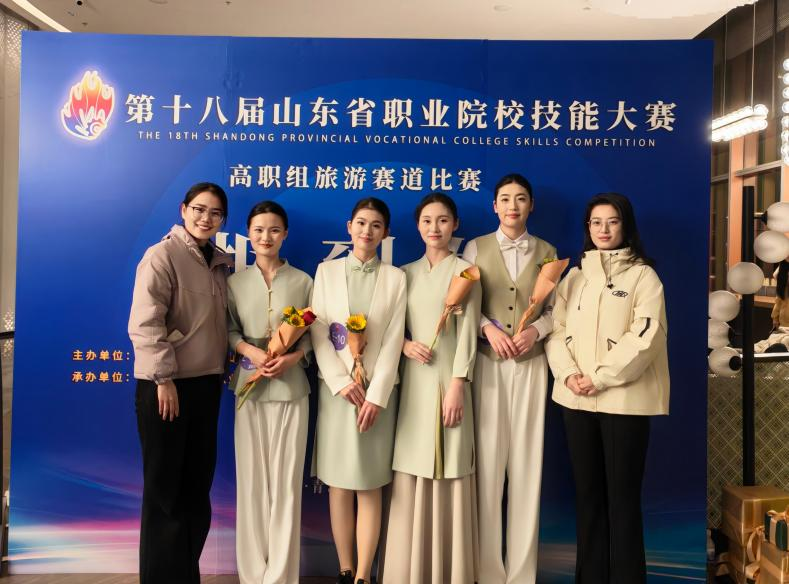 近日,第十八届山东省职业院校技能大赛“旅游赛道”在青岛酒店管理职业技术学院落下帷幕。由我校航空与旅游学院李自娟、田学芬教师指导,王蕊、薛文娟、王思霖、孙汇知四位同学组成的参赛队伍,凭借扎实的专业技能、顽强的拼搏精神和默契的团队协作,从全省53支参赛队伍中脱颖而出,最终斩获二等奖的优异成绩。