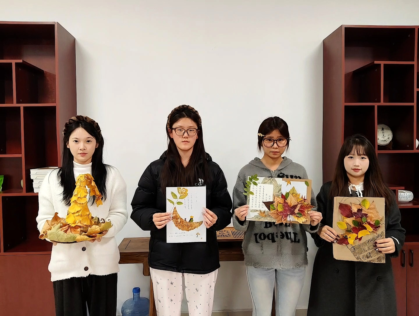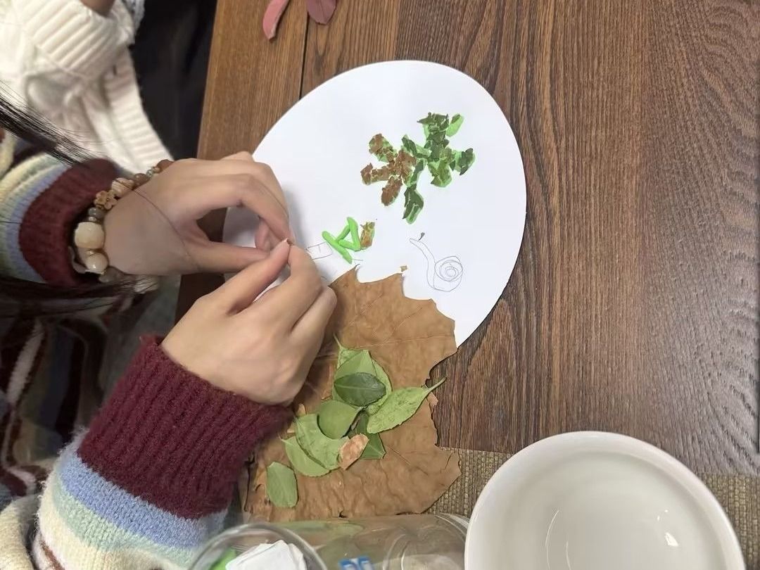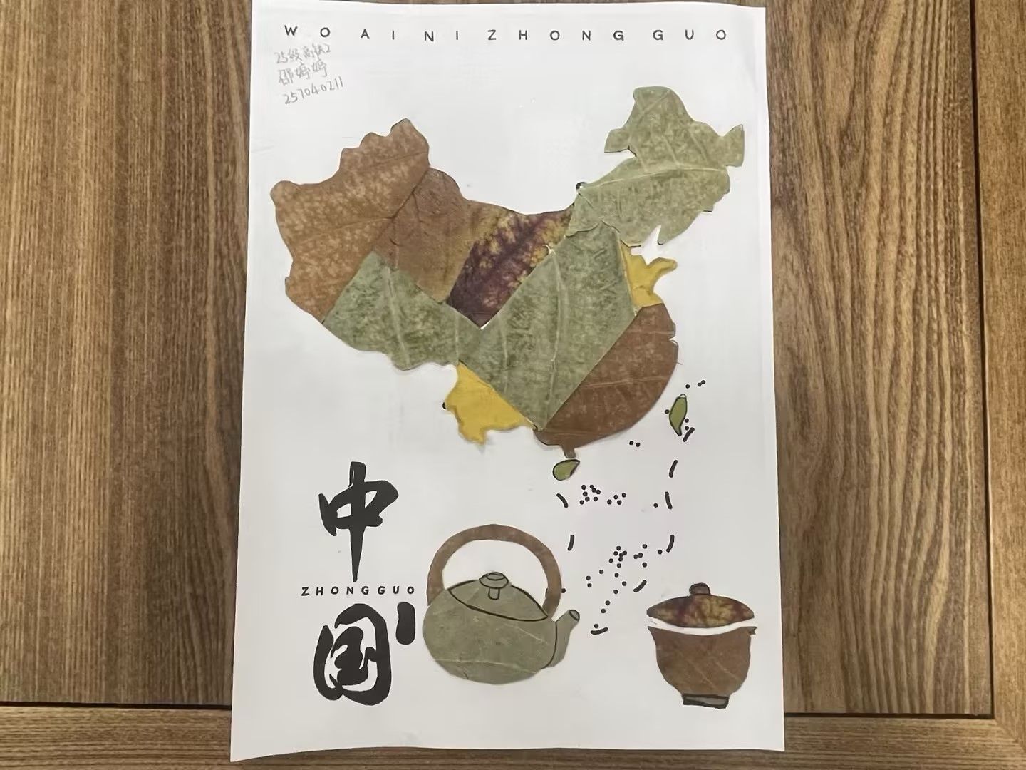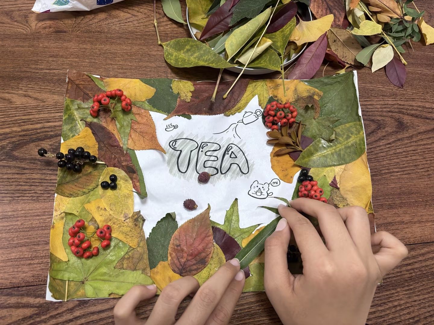 创意实践环节中,同学们使用采集的落叶、树枝、花瓣等材料,以A4纸为画卷,自由创作“秋日主题拼贴画”。一幅幅作品将茶元素与秋日意象巧妙结合,不同自然材质的独特纹理与斑斓色彩,生动呈现出茶与秋交融的诗意场景,每一幅作品都饱含着同学们对自然与文化的独特感悟。