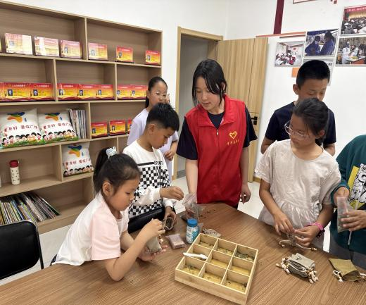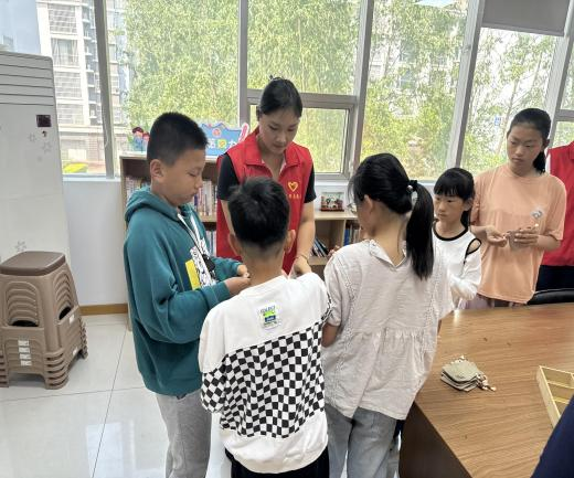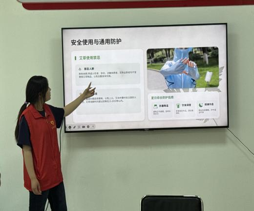 活动过程中,学院中医推拿社志愿者以“课前5分钟”微分享为载体,通过 PPT 生动讲解艾草功效与夏季健康防护知识,带领孩子们深入了解艾草的驱蚊、温经、祛湿等作用,同时学习防晒、补水等夏日养生常识。在志愿者指导下,孩子们亲手制作艾草包,从填充艾绒到封口打结,认真完成每一步,既锻炼了动手能力,也加深了对中医药文化的认知。