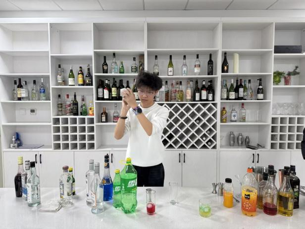 活动现场气氛热烈,同学们以“青春调饮”为核心尽情挥洒创意。有人复刻特调“破晓海岸线”,以龙舌兰酒为基底,搭配橙汁与石榴糖浆,甜润口感适合日常饮用,渐变色泽更是拍照打卡的绝佳选择;有人从电影中汲取灵感,打造“蓝色海洋”,以清爽雪碧打底,融入调制酒液,澄澈的蓝色宛如将深海捧在掌心,尽显青春创意。