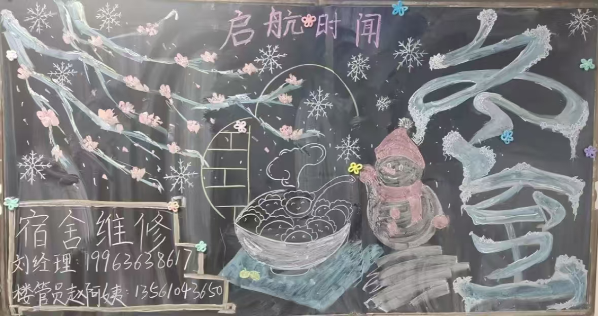 踏入启航社区,冬的气息愈发醇厚,大雪节气的清冽悄然绕上肩头。启航时闻黑板报应着节气焕新登场,粉笔绘就的梅枝疏影横斜,一碗热粥氤氲着暖意,憨态的雪人立在旁侧,把冬日的温柔揉进了这方黑板。愿同学们在冬日里,既能触到社区的清宁与冬韵,也能拥住宿舍的融融暖意,以鲜活的朝气,迎接冬日每一轮朝阳。