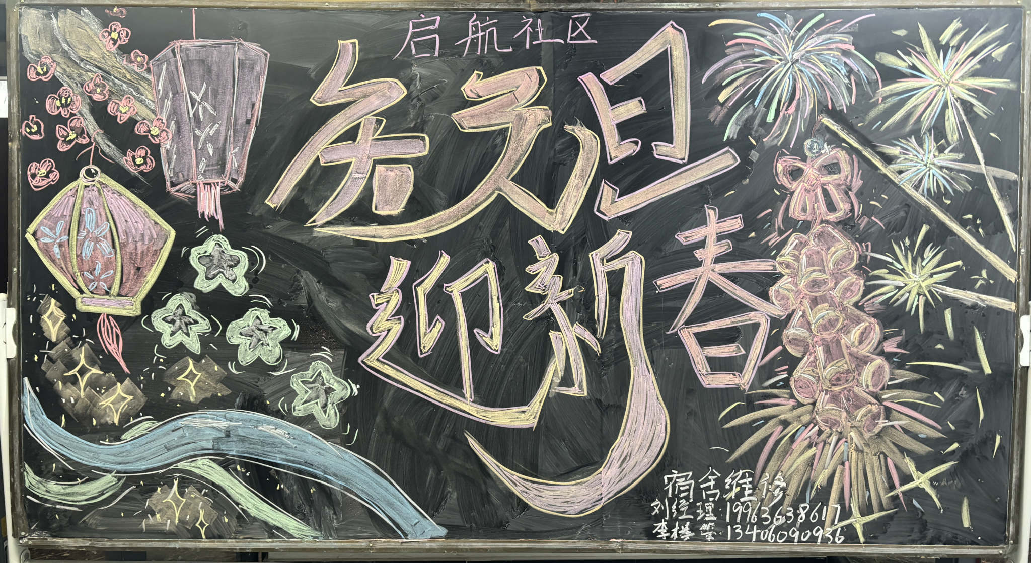 踏入启航社区,一幅洋溢着年味的元旦新春主题板报就映入眼帘。它以墨色的黑板为底,红粉黄蓝的色彩交织,满溢着新年的喜庆与温馨。板报中央用创意立体艺术字书写的“庆元旦 迎新春”六个大字格外吸睛,色彩明快鲜活,仿佛自带欢快的节拍,瞬间将浓郁的节日氛围拉满,尽显创作者的巧思与才情。