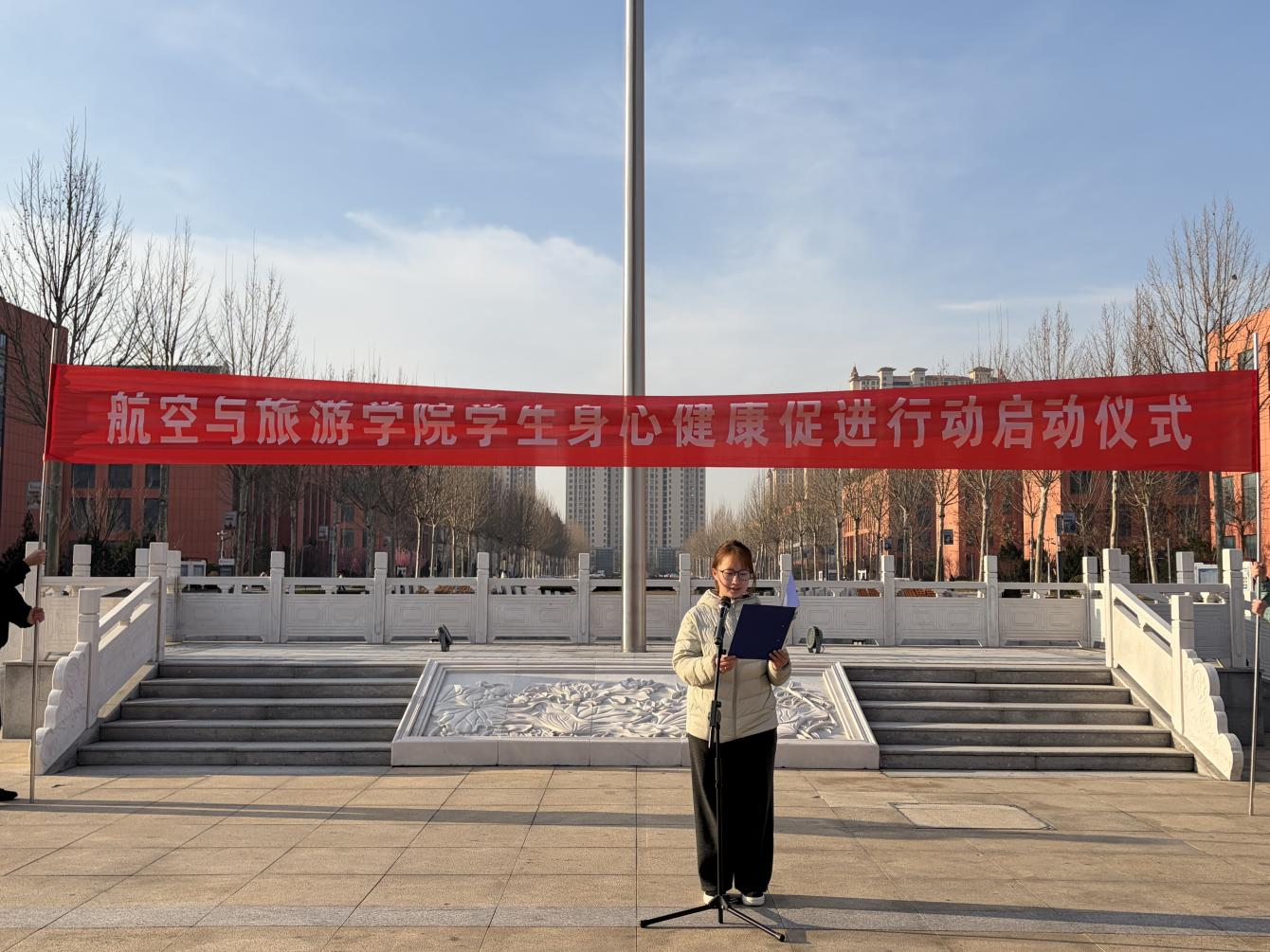 航空与旅游学院院长韩广东宣读《航空与旅游学院学生身心健康促进行动实施方案》,围绕思想引领、体育锻炼、心理健康、习惯养成等方面作出部署,引导同学们以健康体魄和积极心态投入学习生活。