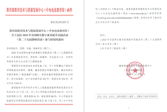 近日,由教育部教育技术与资源发展中心(中央电化教育馆)举办的2025年全国师生数字素养提升实践活动(第二十九届教师活动)评选结果正式公布,我校程通、许学江、苟志恒老师申报的《职教数智中枢:实时流计算驱动高校决策与创新》职业教育专项数字化和智能化应用能力提升案例获评为全国展示作品。
