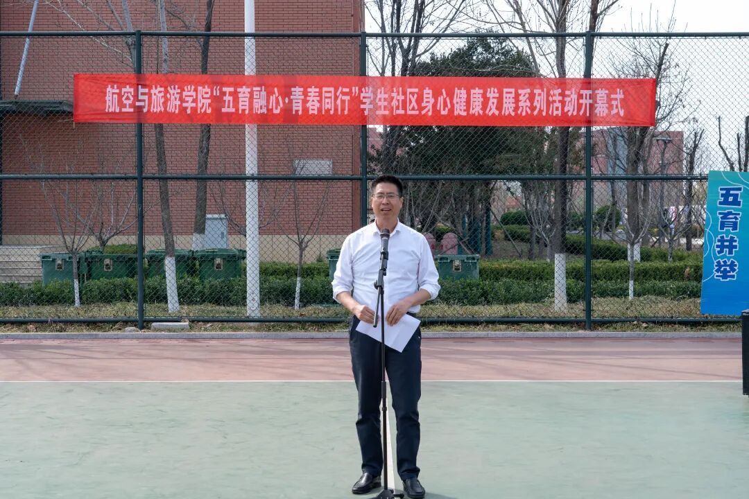 为深入贯彻落实“健康第一”教育理念,全面推进“一站式”学生社区建设,3月26日下午,航空与旅游学院在启航社区隆重举行“五育融心·青春同行”学生社区身心健康发展活动季开幕式。党委委员、副校长徐兴习出席活动并致辞。