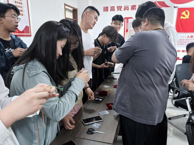 随后,郭老师现场展示彩绳编织技艺,精湛的技艺引得同学们阵阵惊叹,大家纷纷围上前去,仔细观看每一个编织步骤。在郭老师的耐心指导下,同学们迫不及待地拿起彩线,从最基础的打结方法学起,逐步掌握缠绕、编织等技巧。尽管过程中遇到了不少困难,但大家相互交流、相互帮助,现场气氛热烈而温馨。