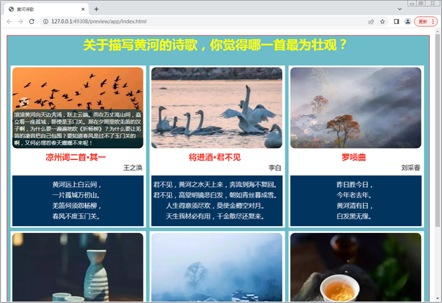 结合选定的诗歌,讲解盒子模型用于构建诗歌文本框、图片展示框等网页元素的结构;利用浮动实现六首诗歌的排列,使页面布局更加灵活美观;运用定位确定图片和诗歌解析等元素在网页中的位置。以《凉州词二首·其一》为例,使用盒子模型创建一个较大的主容器盒子,将顶部设置通过浮动与定位技术使黄河的鸟类图片与诗歌解析鼠标互动展示,诗歌标题与文本置于其下,如图2所示。