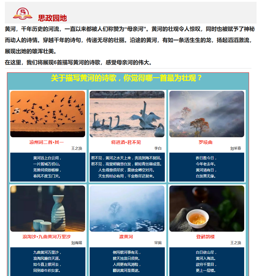 挑选六首具有代表性的黄河诗歌,如《凉州词二首·其一》《将进酒·君不见》《罗唝曲》《浪淘沙·九曲黄河万里沙》《渡黄河》《登鹳鹊楼》,如图1所示。教师引导学生对每首诗歌的意境、情感、历史文化背景进行详细分析,为后续网页设计奠定文化基础。