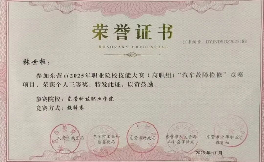 12月18日,2025年东营市职业院校技能大赛圆满落幕。汽车工程学院专业教师张世桓在“汽车故障检修”教师个人赛中脱颖而出,荣获大赛三等奖。