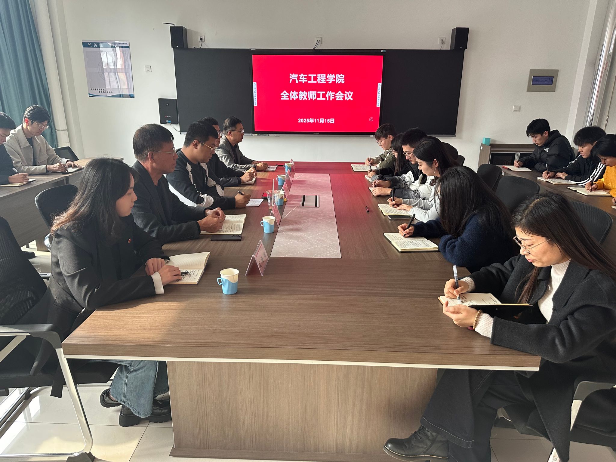 2025年11月15日,汽车工程学院召开全体教师大会,北交知行(北京)教育科技有限公司总经理庞明君、学院领导班子及全体教职工参会。会议聚焦近期工作问题,围绕凝心聚力、提升效能展开座谈交流。
