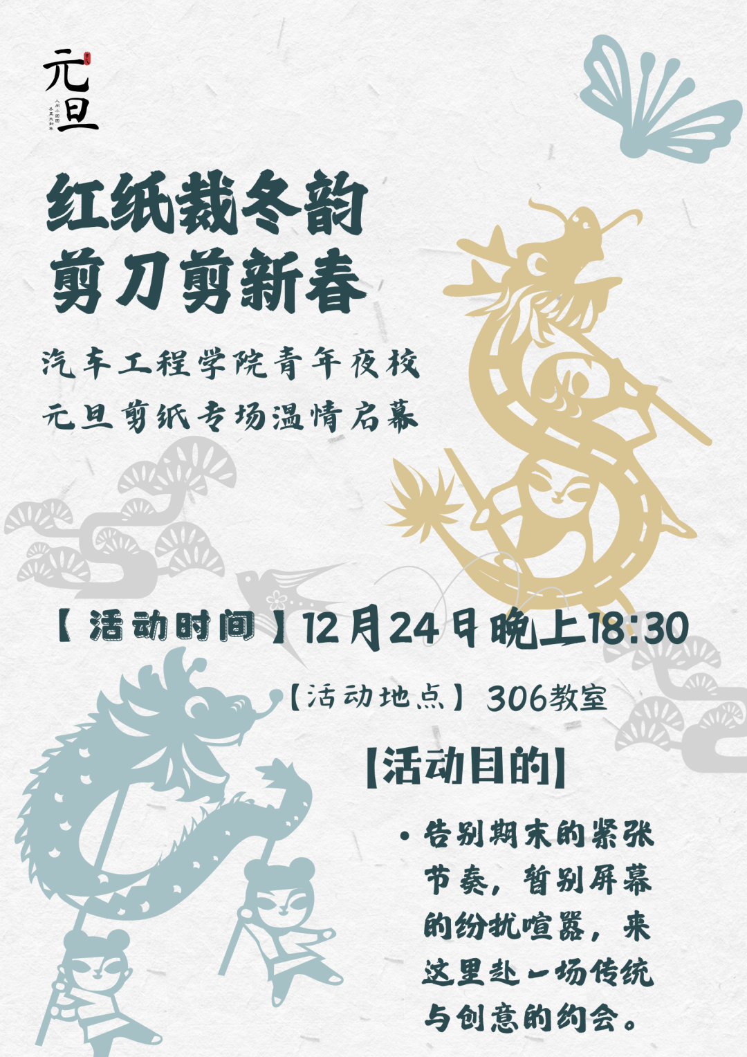 新春将至,年味渐浓。为丰富师生课余生活,传承弘扬中华优秀传统文化,12月24日,汽车工程学院将以“红纸裁年味,剪刀绘新春”为主题,在3-306开展一场充满趣味的剪纸活动,共赴充满趣味与文化气息的指尖之约。