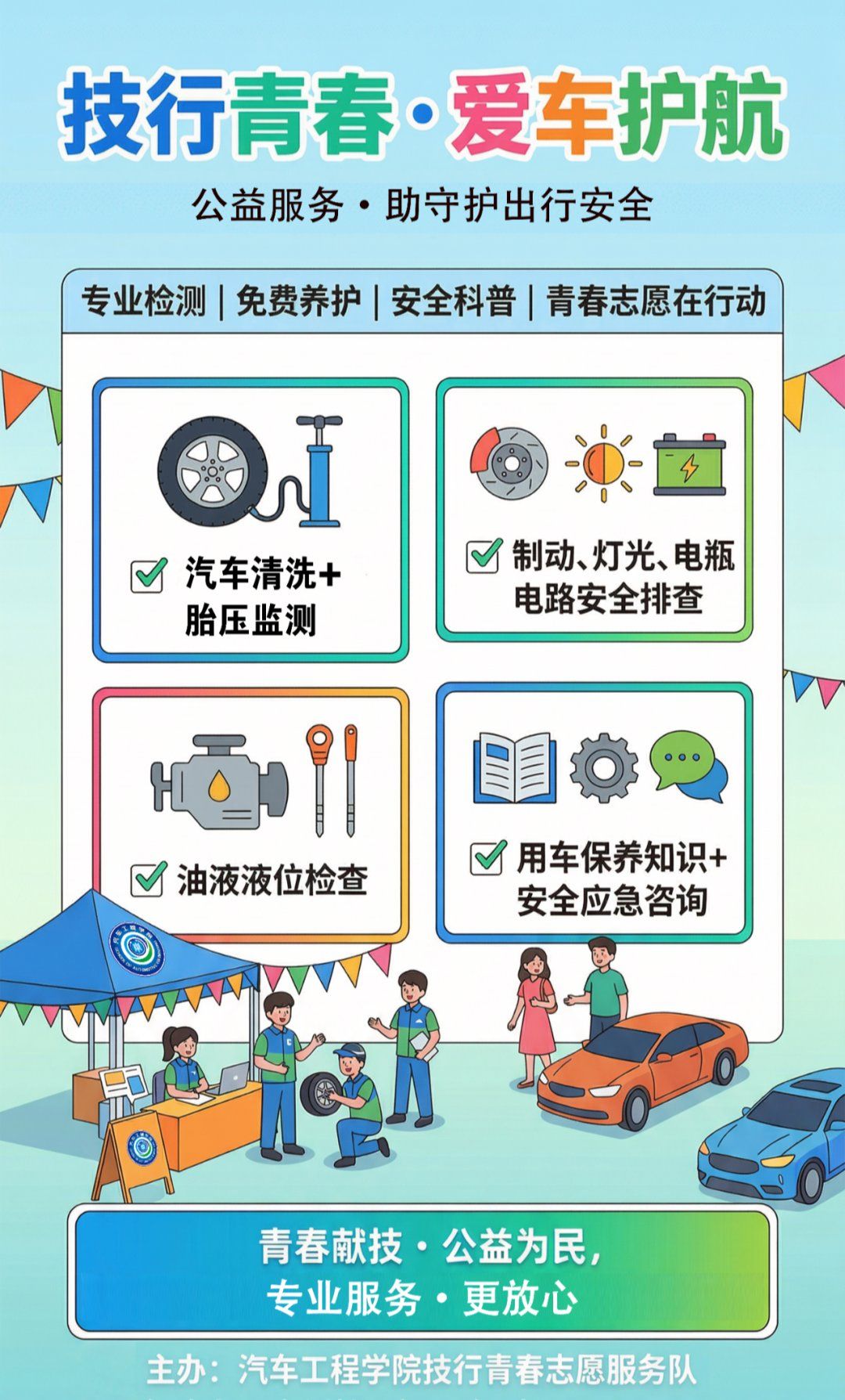 为深入弘扬雷锋精神,推动专业技能服务校园师生,近日,汽车工程学院雷锋月系列活动之“技行青春爱车护航”汽车养护志愿服务活动顺利举办。活动以标准化流程、专业化手艺、多样化服务,为校内师生车辆提供一站式公益养护,获得广泛好评。