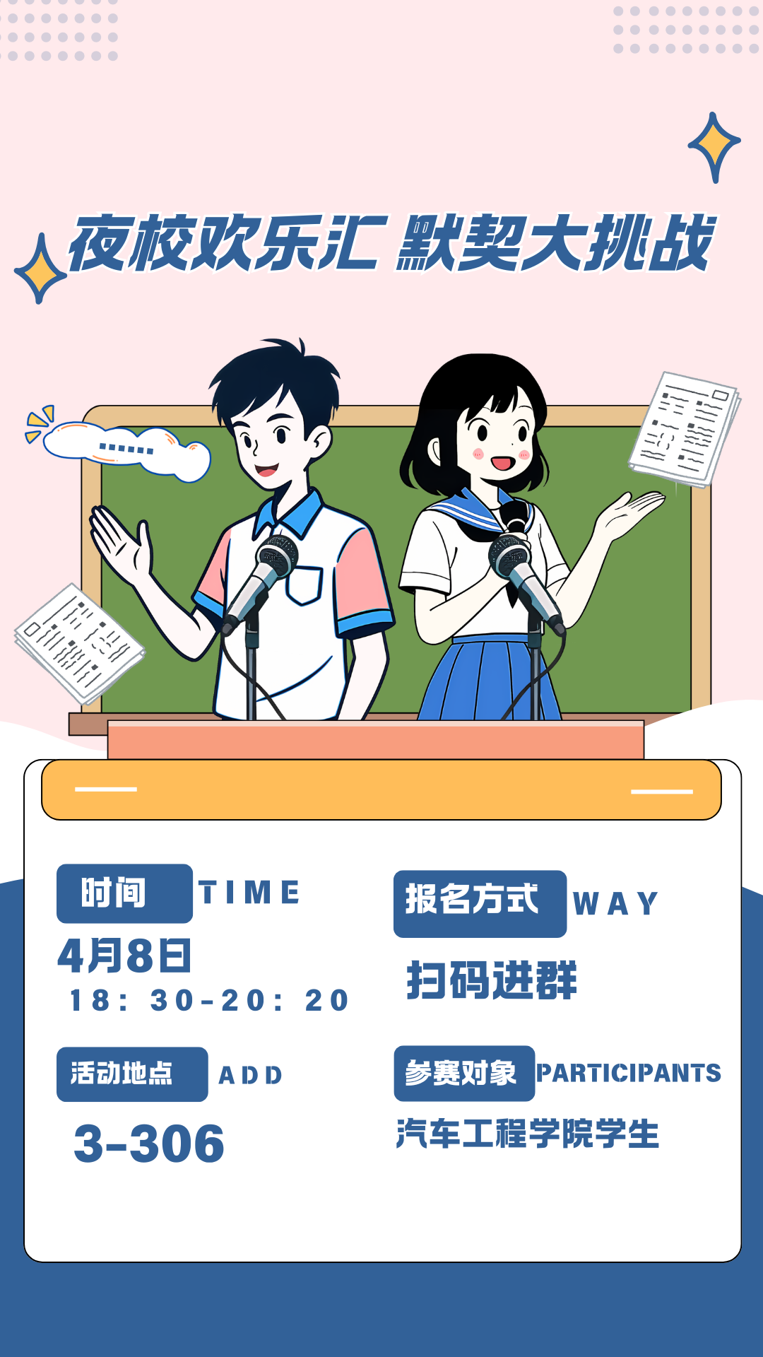 白天我们为生活忙碌,夜晚因热爱相聚。今天,我们用一场轻松有趣的默契搭档猜词,拉近彼此距离。本次活动两人一组,一人比划一人猜,限时2分钟,题目既有夜校课程相关内容,也有日常趣味热词。不考验技巧,只比拼默契!希望大家在欢声笑语中放松心情、收获快乐,现在,趣味挑战正式开始!