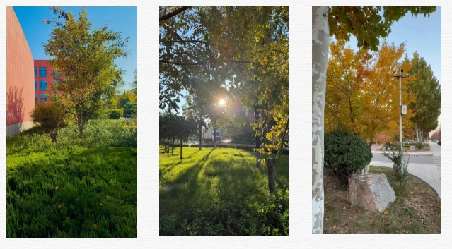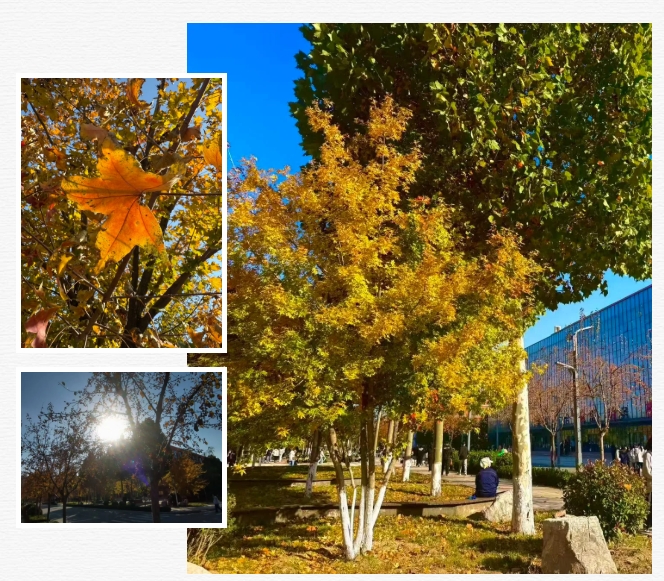 午后的阳光变得柔和,实训楼旁的小花园成了秋日“宝藏地”。高大的法桐褪去了盛夏的浓绿,叶子渐渐染成浅黄、橙红,层层叠叠地搭成天然的“遮阳伞”。石凳上,总有学子捧着书本静坐,偶尔抬头,便能看见阳光透过叶隙洒下的光斑,在书页上轻轻晃动