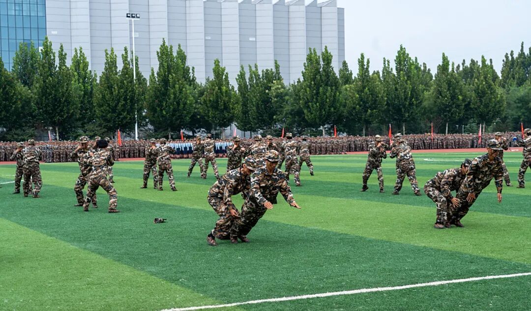 在军训汇演中,同学们以嘹亮的口号、整齐的队列和铿锵的步伐接受了检阅。随后进行的刺杀操、匕首操、摔擒倒功及战地救护军事技能展示,动作标准、气势如虹,充分展现了东科学子英姿飒爽的精神面貌和昂扬向上的青春风采。