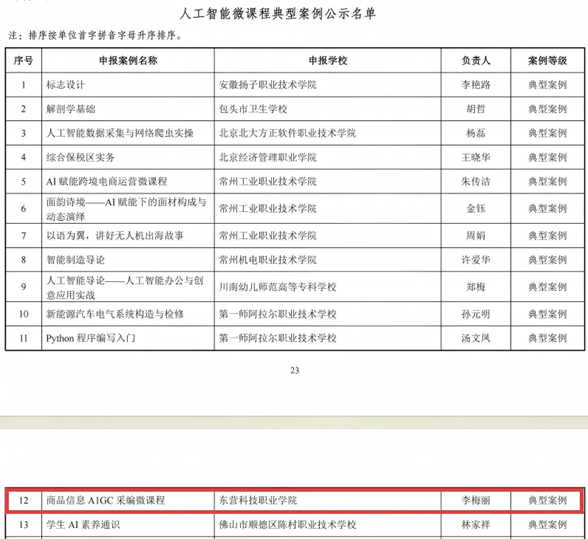 近日,教育部职业院校信息化教学指导委员会发布《关于人工智能应用典型案例遴选结果的公示》,我校李梅丽老师主持的“商品信息AIGC采编微课程”成功入选人工智能微课程典型案例,标志着学校在人工智能赋能专业教学 领域的实践成果获得国家级认可。