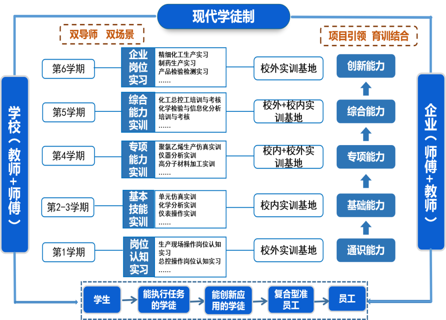 思政引领,校企联动:以“宣言精神铸魂、工匠精神追梦”打造化工育人品牌,创建省级党建成果。发挥“双带头人” 引领作用,通过校企党支部联建增强育人功能,构建全环境育人新格局。组建由思政教师、专业教师、企业专家等组成的思政育人队伍,融合学校、企业、行业、家庭、社会、网络等多方资源,打造第一、二、三课堂,开展“宣言”故事会、企业实习实践等活动,实施课程思政示范工程。多元共建,深度协同:打造“多元深度协同、共建共治共享” 产教融合平台,依托联合体构建“三位一体”高端化工技术协同创新平台,立项教育部供需对接育人项目 4 项。通过理事会(政行校企)统筹,设立秘书处与各专委会,开展现代产业学院、现场工程师学院建设,推进订单班培养、产学研训等工作,实现产业链、人才链、教育链、创新链的有效衔接。机制创新,要素改革:创新“双师双景、育训结合”现代学徒制人才培养模式,分学期进阶培养通识、基础、专项、综合、创新能力,结合校内校外实训基地,由企业师傅与学校教师共同指导。以课程建设为核心,衔接专业教育与职业培训,开设微专业,培养新质生产力急需的高技能人才。