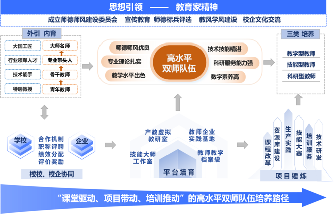 以教育家精神为引领,对标《新时代高校教师行为十项准则》实施师德铸魂工程,成立师德师风建设委员会,开展宣传教育、师德标兵评选等活动。采用“外引内育”模式,按“教学型、技能型、科研型”分类培养教师,外引大师名师、大国工匠、行业领军人才等,内育专业带头人、骨干教师、青年教师。破除“五唯”评价,设定差异化、标志性评价指标,通过“课堂驱动、项目带动、培训推动”路径,提升教师教学、技术技能与科研服务能力,打造师德师风优良、技术技能精湛、数字素养高的高水平双师队伍。